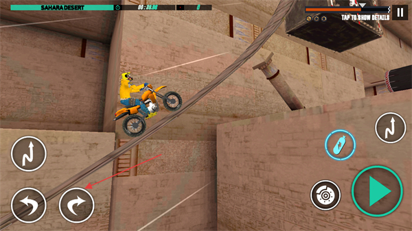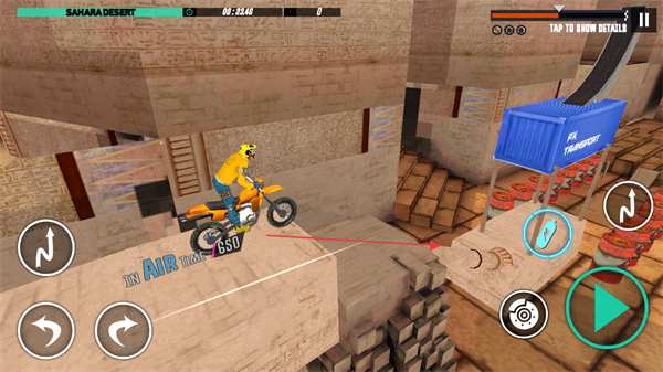 2、駕駛摩托車飛躍建筑間隙,在空中保持平衡,積累空中時間,完成特技動作獲取高分。