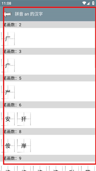 4、進(jìn)入拼音an的漢字頁面后,可查看對應(yīng)筆畫數(shù)的漢字內(nèi)容。