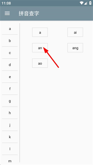 3、在拼音查字頁面,點(diǎn)擊an選項(xiàng),可查看拼音為an的漢字列表。