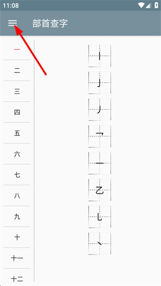 1、在快查字典首頁,點(diǎn)擊左上角的菜單按鈕,可展開功能選項(xiàng)列表。