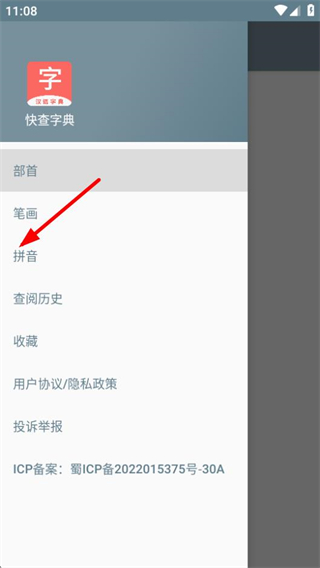2、在功能選項(xiàng)列表中,點(diǎn)擊拼音選項(xiàng),可切換至拼音查字頁面。