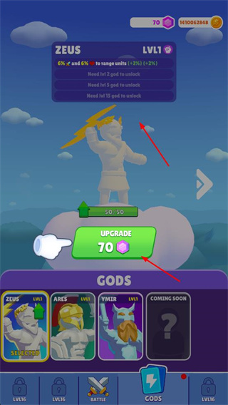 1、升級神祇,提升其等級和戰(zhàn)力,為戰(zhàn)斗提供強力支持,開啟神話主題的攻防對戰(zhàn)進程。