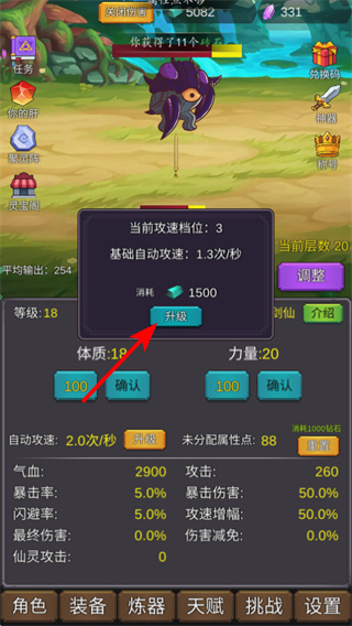 2、點(diǎn)擊升級(jí)按鈕,消耗資源提升自動(dòng)攻速檔位,攻速提升后可增加攻擊頻率,提升打怪效率。