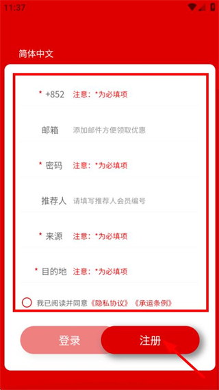4、在注冊頁面,填寫信息并勾選協(xié)議后,點擊注冊即可完成注冊。