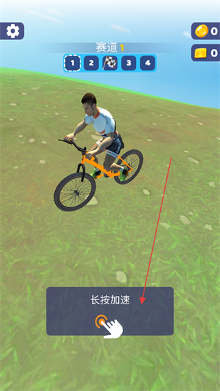 1、長(zhǎng)按加速按鈕,控制自行車(chē)在草地賽道上加速行駛,開(kāi)啟比賽。