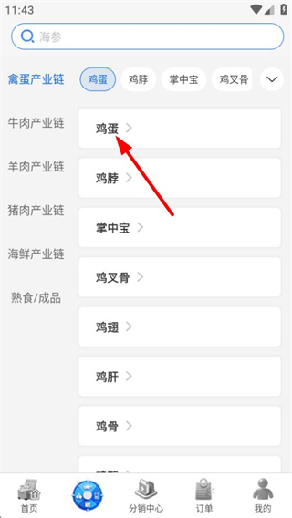2、進入分類頁面后,點擊禽蛋產(chǎn)業(yè)鏈下的雞蛋選項,可查看雞蛋相關(guān)商品列表。