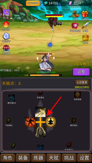 4、進(jìn)入天賦界面,合理分配天賦點(diǎn),如點(diǎn)擊攻擊強(qiáng)化類天賦,可提升角色攻擊屬性,為修仙戰(zhàn)斗提供更強(qiáng)戰(zhàn)力支持。