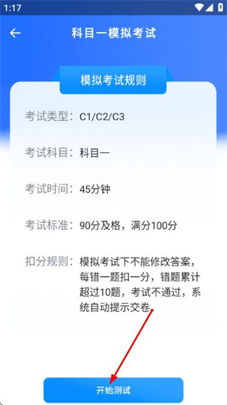 2、在科目一模擬考試規(guī)則頁面查看考試要求后,點擊開始測試,進入模擬考試答題頁面。
