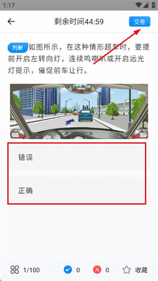 3、在模擬考試答題頁面選擇題目對應的選項,完成答題后可點擊交卷查看成績。