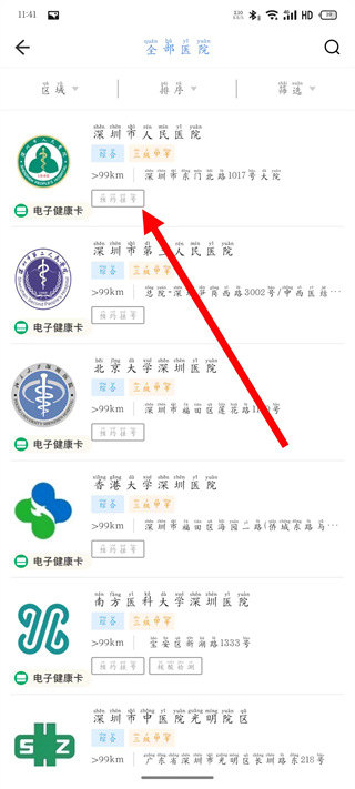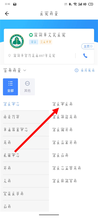 2、選擇目標(biāo)醫(yī)院,點(diǎn)擊深圳市人民醫(yī)院,進(jìn)入科室列表。