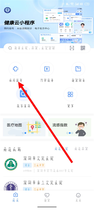 1、打開健康深圳,在首頁點(diǎn)擊預(yù)約掛號(hào),進(jìn)入頁面。