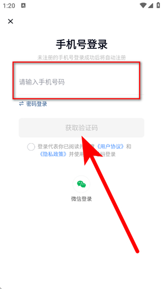 3、在手機(jī)號(hào)登錄頁(yè)面,輸入手機(jī)號(hào)碼,勾選后,點(diǎn)擊獲取驗(yàn)證碼。