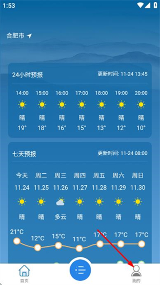 1、在皖美氣象首頁點(diǎn)擊底部我的,進(jìn)入個(gè)人相關(guān)操作頁面。