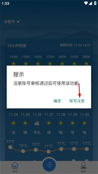 2、在彈出的提示窗口中點(diǎn)擊賬號(hào)注冊(cè),進(jìn)入皖美氣象的賬號(hào)登錄注冊(cè)頁面。