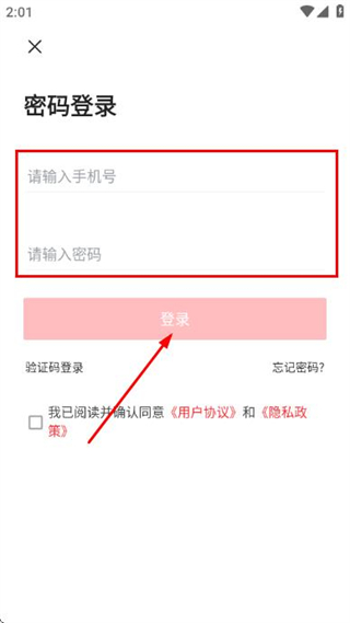 3、在密碼登錄頁面填寫手機號和密碼,勾選協(xié)議后,點擊登錄完成賬號登錄操作。
