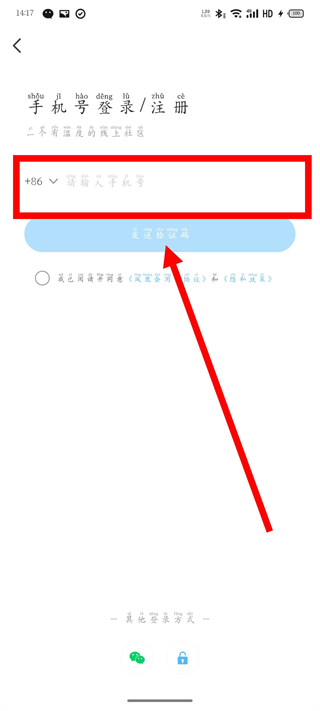 3、在手機(jī)號(hào)登錄注冊(cè)頁(yè)面,輸入手機(jī)號(hào),點(diǎn)擊發(fā)送驗(yàn)證碼。