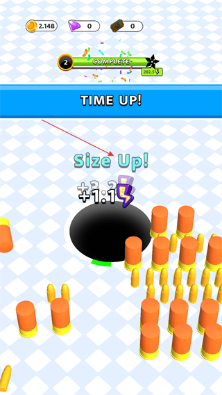 3、上方的進(jìn)度條滿會(huì)觸發(fā)黑洞升級(jí),擴(kuò)大黑洞的面積更好的吞噬彈藥。