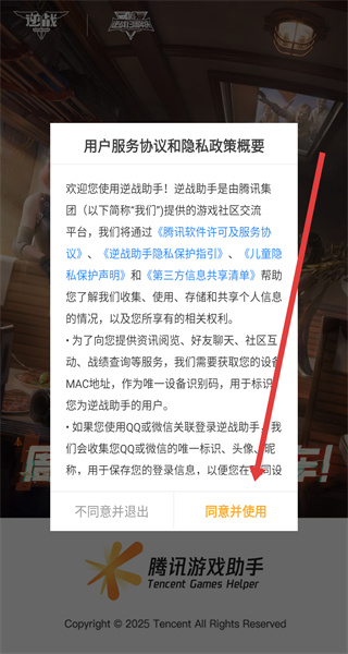 1、想打開逆戰(zhàn)助手App后,可以點擊彈窗中的同意并使用按鈕,進入使用。