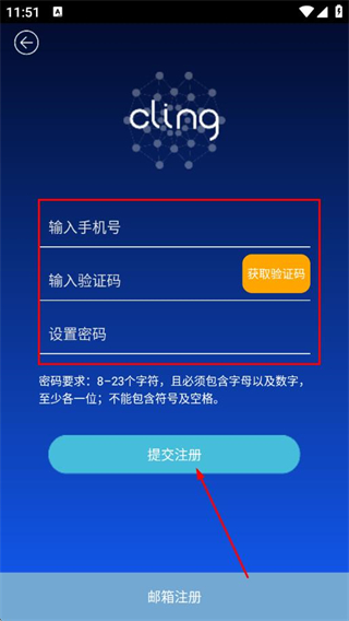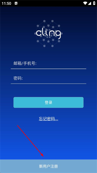 1、打開Cling APP,在登錄頁面點(diǎn)擊新用戶注冊(cè)。