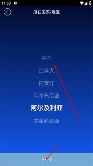 2、在所在國(guó)家/地區(qū)頁面選擇中國(guó),點(diǎn)擊下一步。