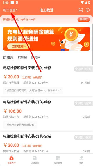 1、打開e電工APP,在搶單大廳頁面點擊左上角用工信息選項。