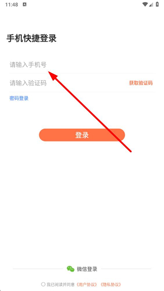 2、在手機快捷登錄頁面,輸入手機號并獲取驗證碼完成登錄操作。