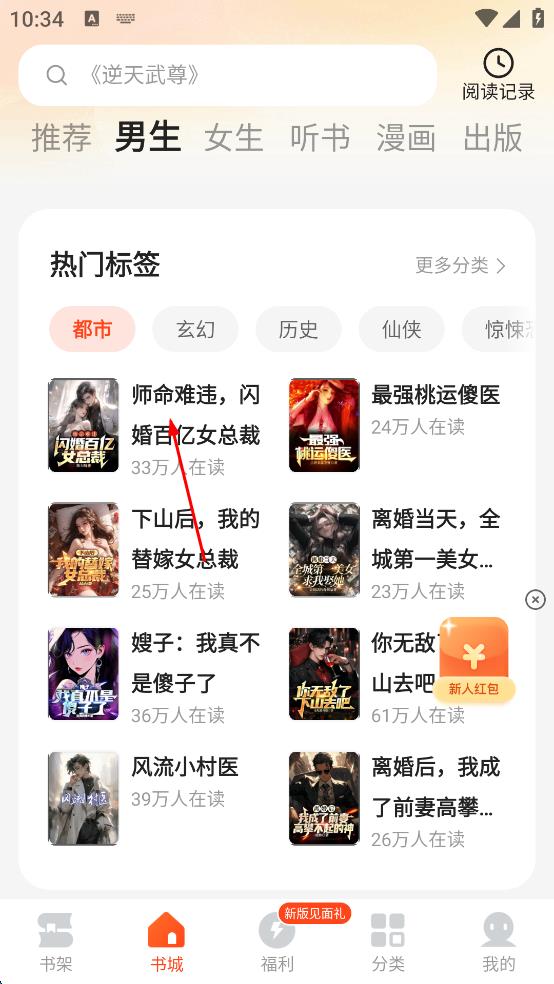 3、在男生小說(shuō)推薦頁(yè)面,選擇感興趣的小說(shuō)標(biāo)簽,比如點(diǎn)擊“都市”標(biāo)簽,查看該標(biāo)簽下的小說(shuō)列表。