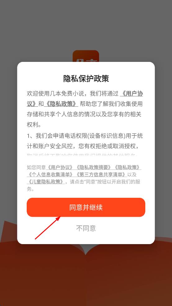 1、打開(kāi)幾本免費(fèi)小說(shuō),進(jìn)入后會(huì)彈出隱私保護(hù)政策提示框,點(diǎn)擊“同意并繼續(xù)”按鈕,進(jìn)入軟件主界面。