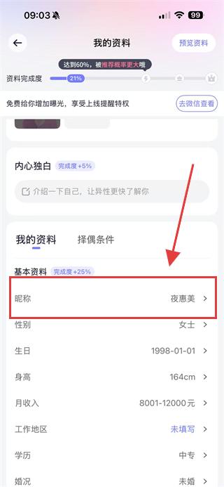 2、在個人頁面中進入我的資料頁面,找到昵稱選項并點擊。