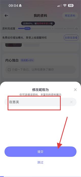 4、輸入完成后點擊提交,即可完成珍愛APP的昵稱修改操作。