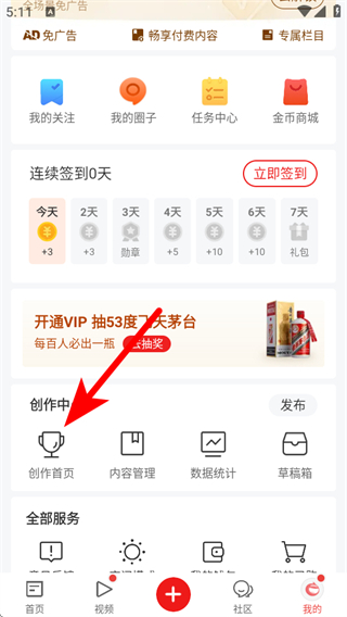 2、在個(gè)人板塊頁(yè)面,點(diǎn)擊創(chuàng)作首頁(yè)選項(xiàng),進(jìn)入創(chuàng)作新人界面。