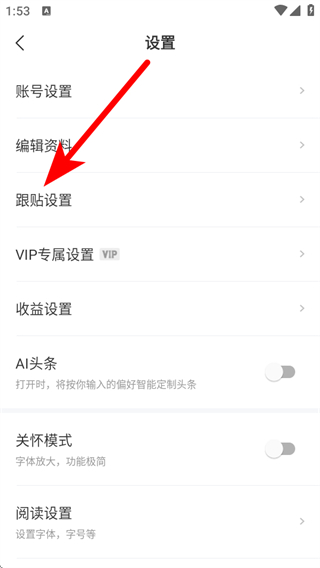 3、在設(shè)置的頁(yè)面,點(diǎn)擊跟貼設(shè)置,進(jìn)入跟貼設(shè)置的頁(yè)面。