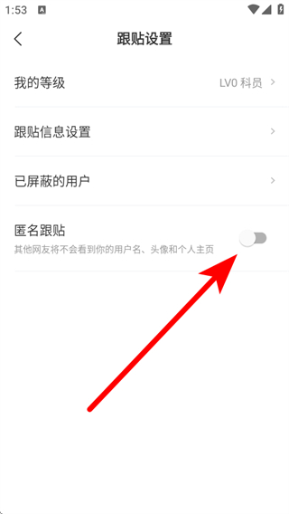 4、在頁(yè)面找到匿名跟貼選項(xiàng),將其開關(guān)開啟,即可開啟匿名跟帖功能。
