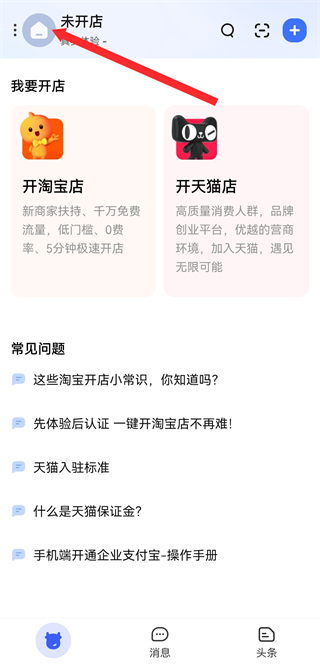 1、打開千牛APP點(diǎn)擊左上角未開店標(biāo)識(shí),進(jìn)入開店頁面。