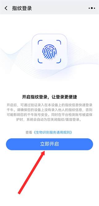 4、點(diǎn)擊立即開啟按鈕,按照提示完成操作,即可開啟指紋登錄功能。