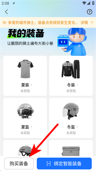4、在我的裝備頁(yè)面,點(diǎn)擊購(gòu)買裝備按鈕,即可進(jìn)入裝備購(gòu)買流程。