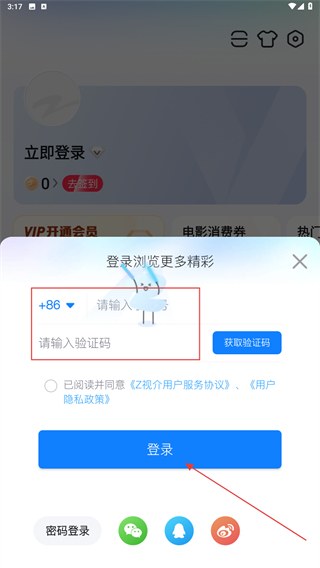 3、輸入手機號、驗證碼后,點擊登錄的按鈕即可完成。