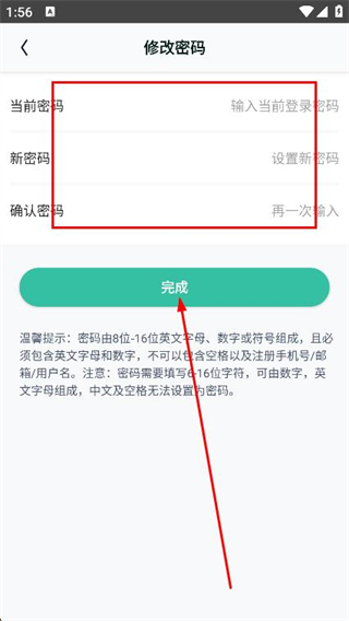 4、根據(jù)提示設(shè)置密碼,點(diǎn)擊完成按鈕即可修改密碼。