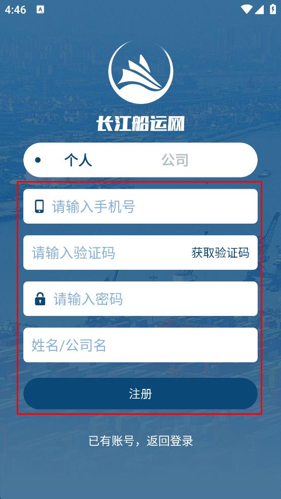 4、在注冊頁面,依次輸入手機號、驗證碼、密碼以及姓名或公司名,然后點擊“注冊”,即可完成長江船運網(wǎng)的注冊。