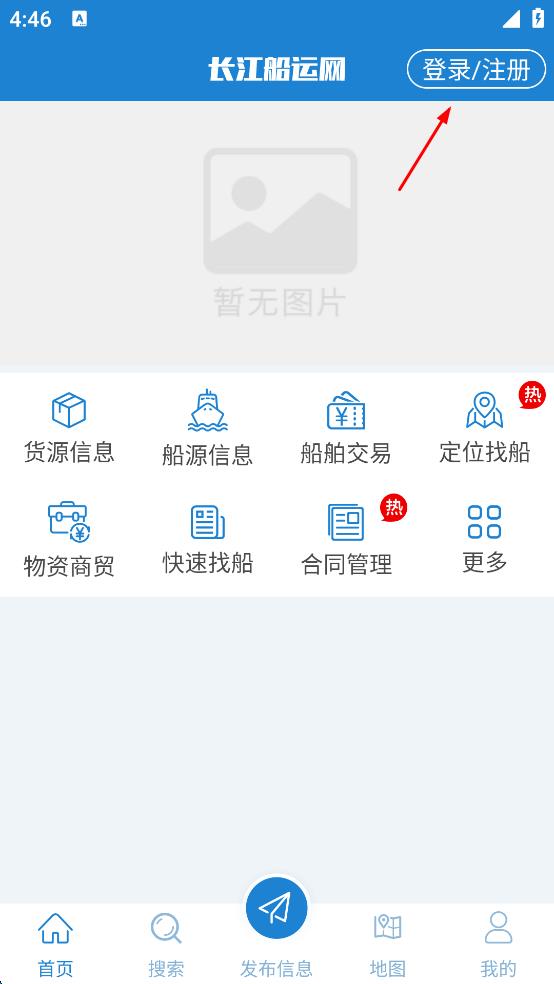 2、在長江船運網(wǎng)主界面,點擊右上角“登錄/注冊”,進入登錄界面。