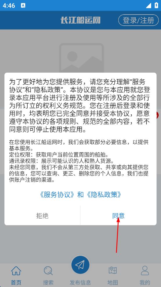1、打開長江船運網(wǎng),在彈出的服務(wù)協(xié)議和隱私政策提示框中,點擊“同意”,進入長江船運網(wǎng)主界面。