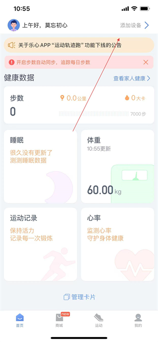 1、打開樂心健康A(chǔ)PP,點(diǎn)擊右上角添加設(shè)備選項(xiàng)。