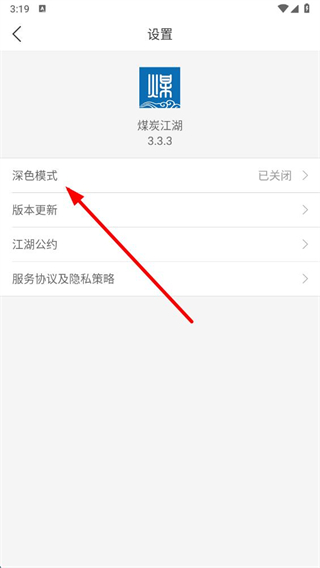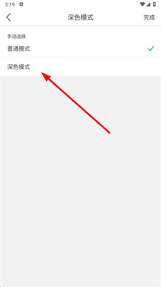 4、在深色模式設(shè)置頁(yè)面,選擇深色模式,點(diǎn)擊完成即可完成煤炭江湖深色模式的設(shè)置操作。