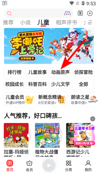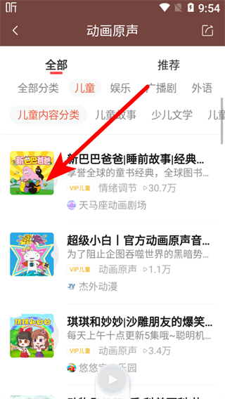 2、在兒童頻道頁(yè)面,點(diǎn)擊動(dòng)畫(huà)原聲選項(xiàng),進(jìn)入動(dòng)畫(huà)原聲分類(lèi)頁(yè)面。