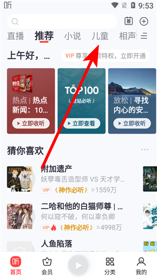 1、在喜馬拉雅首頁(yè),點(diǎn)擊兒童選項(xiàng),進(jìn)入兒童頻道頁(yè)面。