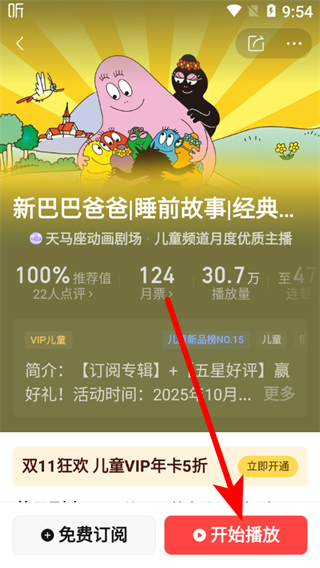 4、在兒童劇詳情頁(yè)面,點(diǎn)擊開(kāi)始播放按鈕,即可觀看喜馬拉雅兒童劇。