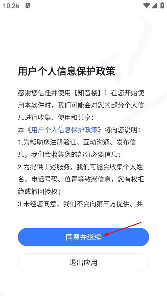 1、打開知音樓APP,在彈出的用戶個人信息保護(hù)政策提示框中,點(diǎn)擊同意并繼續(xù)。