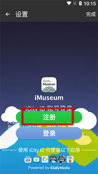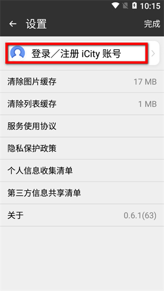 2、在設(shè)置頁面,點擊登錄/注冊iCity賬號選項,進(jìn)入賬號注冊界面。