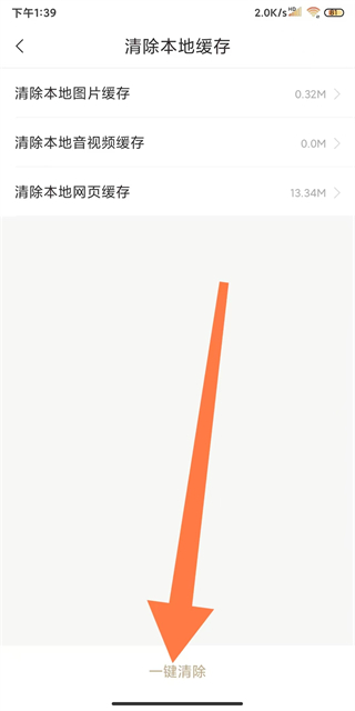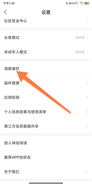 3、在設(shè)置頁面,點擊清除緩存選項,進入緩存清理界面。