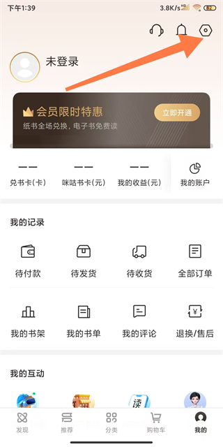 1、打開咪咕云書店APP,點擊進入我的頁面,找到右上角的設(shè)置圖標(biāo)并點擊,進入設(shè)置界面。